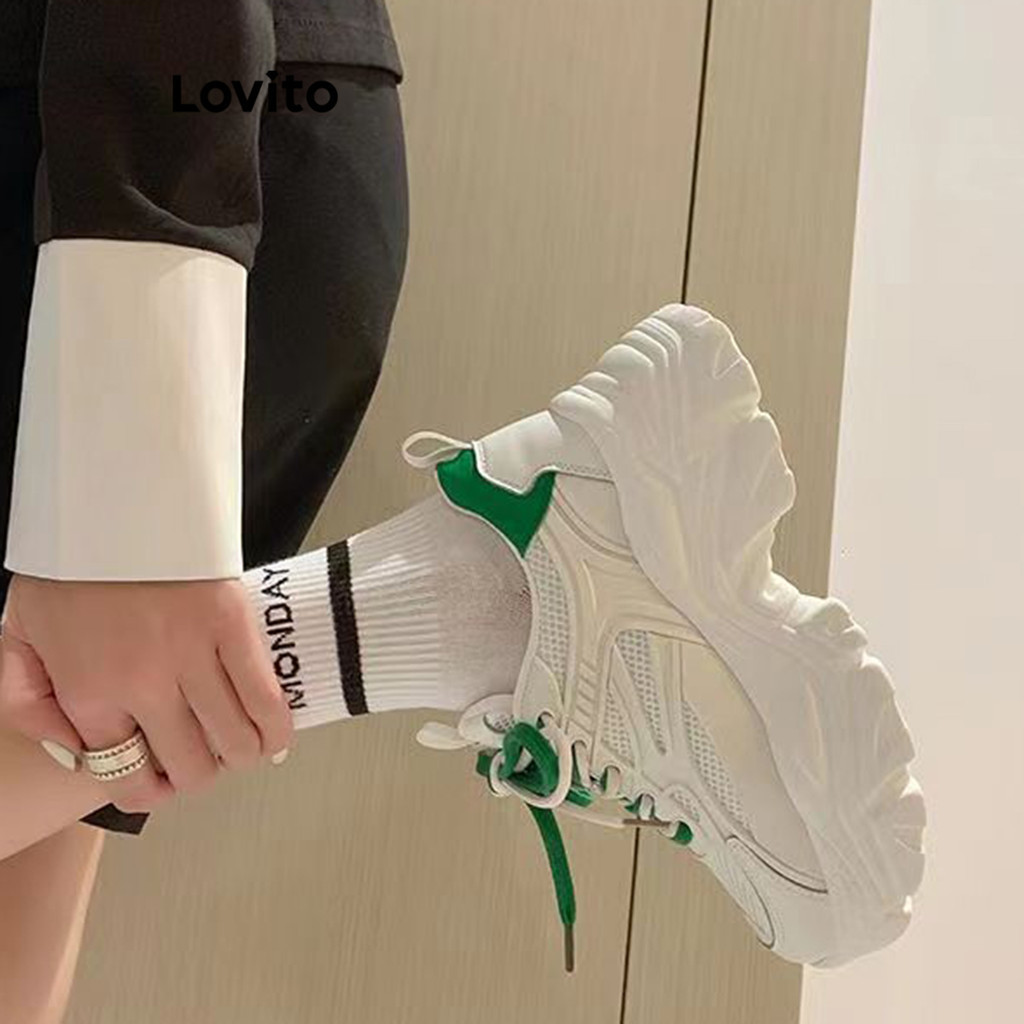 Lovito Preppy Plain Contrast Mesh Dad Shoes Thick Sole Sneakers for Women LFA22012