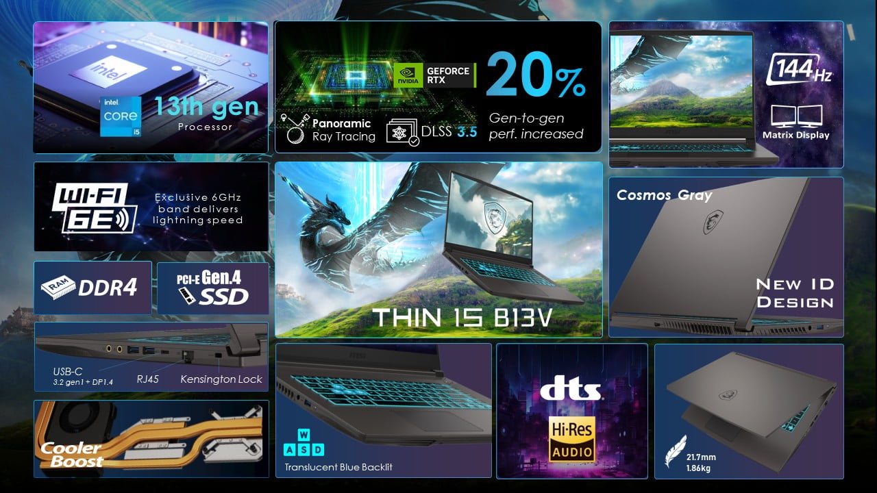 The MSI Thin 15 B13VF-2829US is a sleek and lightweight gaming laptop designed for high-performance tasks and portability. Featuring a 15.6” 144Hz FHD Thin Bezel IPS display and powered by the Intel Core i5-13420H processor with NVIDIA GeForce RTX 4060 8GB graphics, it delivers smooth visuals and exceptional performance. Equipped with 16GB DDR4 memory and a 512GB NVMe SSD, this laptop ensures fast load times and efficient multitasking. The Cosmos Gray design, blue keyboard with anti-ghosting (99 keys), Intel Wi-Fi 6E, and Bluetooth 5.3 add to its modern appeal. ust 4.1 lbs with a 52.4Wh Lithium-Polymer battery, it’s perfect for gamers and professionals on the go.