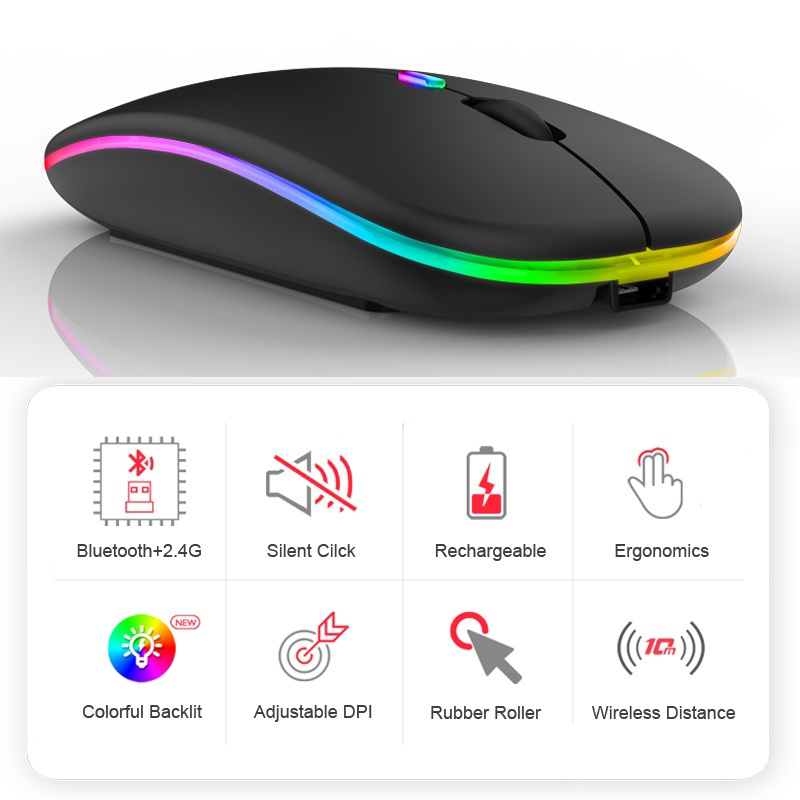 (SG STOCK) Wireless Mouse Rgb Led 2.4Ghz Silent Rechargeable 1600dpi Slim Portable With USB Receiver Computer PC Laptop